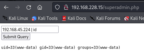 Cela fonctionne ! Maintenant nous allons tenter d'obtenir un reverse shell, mais certains caractères semblent bloquer. Nous allons lire le fichier php. Pour cela on remplace id par "cat superadmin.php" puis nous lisons le code source.